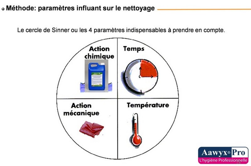 Le nettoyage fait en général intervenir quatre paramètres : une action mécanique (pression de l'eau, frottement…), chimique (dissolution de certaines matières dont les graisses), la température de l'eau servant à la dilution de la solution et enfin le temps d'action du détergent (cercle de Sinner ou CINER).