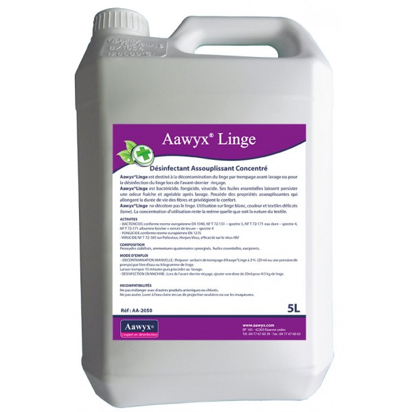 Désinfection et décontamination du lingepar trempage avant lavage ou pour la désinfection du linge lors de l'avant-dernier rinçage.