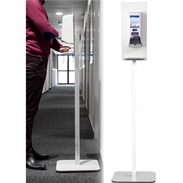 le support sur pied inclus un distributeur à coude, une cartouche de gel hydroalcoolique et un protocole de lavage des mains.