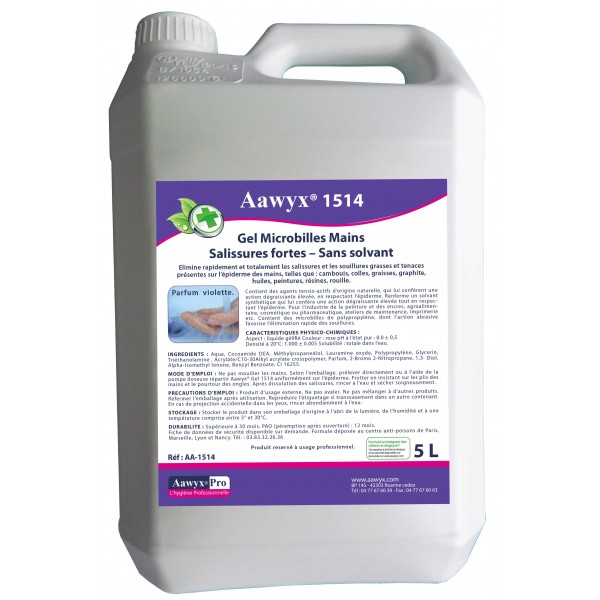 Aawyx®AA-1514 est un gel pour le lavage des mains fortement souillées. Elimine rapidement les salissures : cambouis, colles, graisses, graphite, huiles, peintures, résines, rouille.