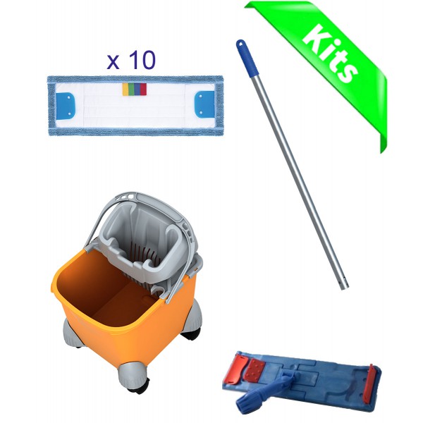 Ce kit comprend un seau avec grille essoreuse et roulettes qui est destiné à l'entretien de vos sols. Equipé d'un seau de 20 litres doté d'une presse avec porte manche intégré, un manche aluminium avec un support de 40 cm et 10 franges.
