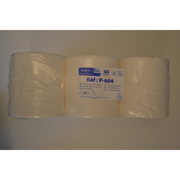 Bobine d'essuyage à dévidage centrale de qualité 100% pure ouate de cellulose, 2 plis DESL alimentaire et écolabel.