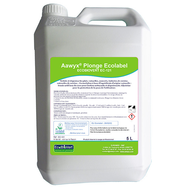 Ecobiovert® EC-121 produit Ecolabel pour le Lavage et dégraissage à la main des plats, vaisselles, couverts, batteries et ustensiles.